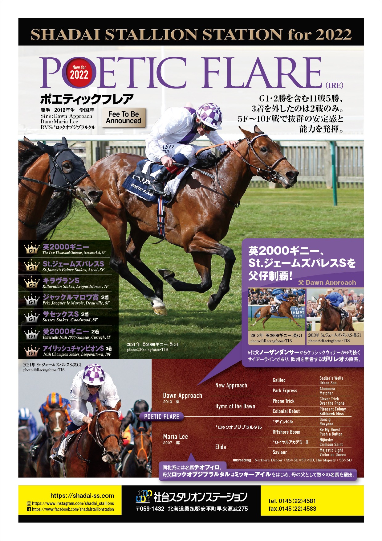 クラシックレースの英2000ギニーと、欧州3歳マイル王者決定戦といえるSt.ジェームズパレスSの父仔制覇を達成し、2つのG1タイトルを獲得したポエティックフレア(Poetic Flare)を、2022年度より社台スタリオンステーションに導入いたします。