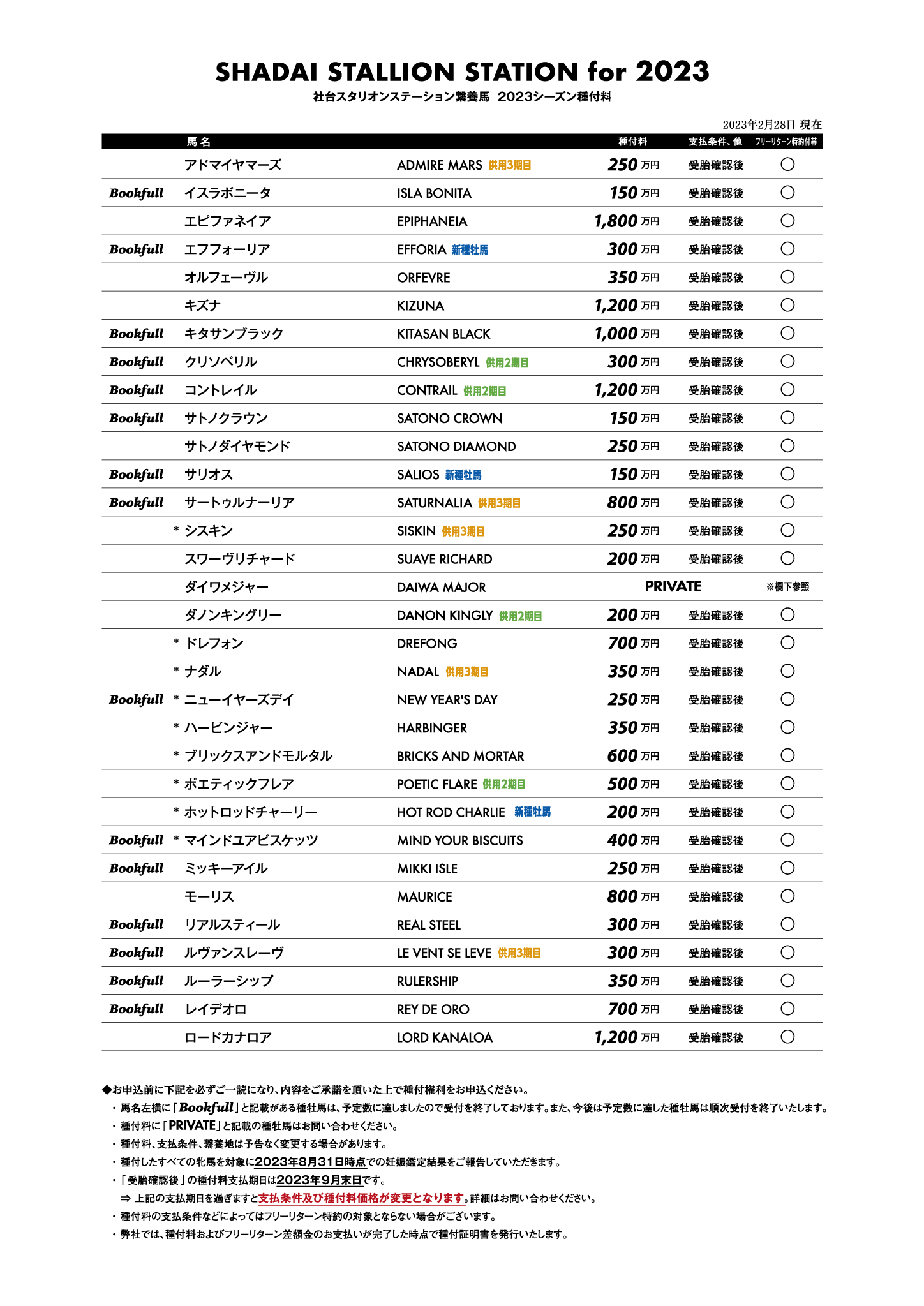 2023年度の社台スタリオンステーション繋養全種牡馬の種付料一覧及び、申し込み状況を更新いたしました。