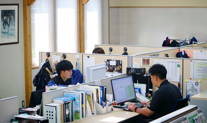 有限会社社台コーポレーションは、種牡馬部門の『社台スタリオンステーション』、馬の総合医療施設の『社台ホースクリニック』のほか、サラブレッドの繁殖部門である『白老ファーム』、中期育成部門の『白老ファームイヤリング』といった4つの部門で構成されています。生産から中期育成まで一貫して働くことができ、また、繁殖牝馬だけではなく牧場に帰ってきた生産馬を種牡馬として迎え、社員自らの手で次の世代へと血をつなぐことができるのは、弊社で働く最大の魅力です。